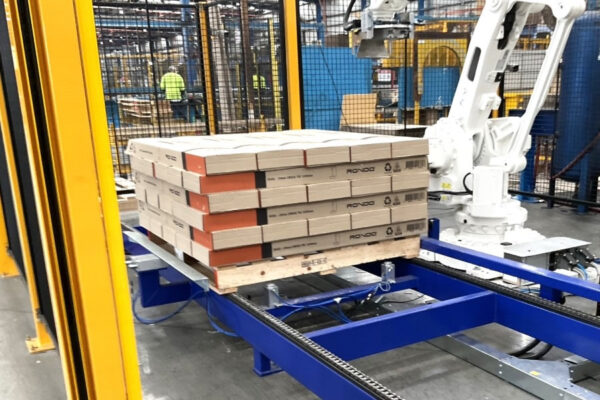 The robot controller interfaces with the Roll Former and Packer, and when a carton is completed at the Packer, the robot retrieves it and stacks onto the pallet following a programmed recipe for each product. Once a pallet is complete, it is transferred to the end of the line as a new empty pallet moves into the robotic cell.